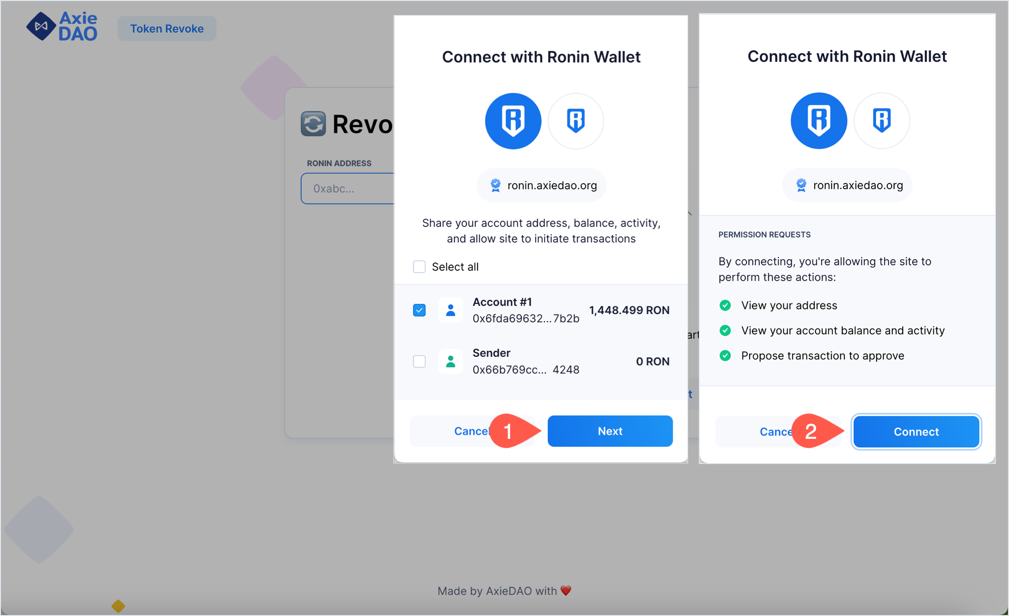1. Open the Revoke tool and click Connect to Ronin Wallet.