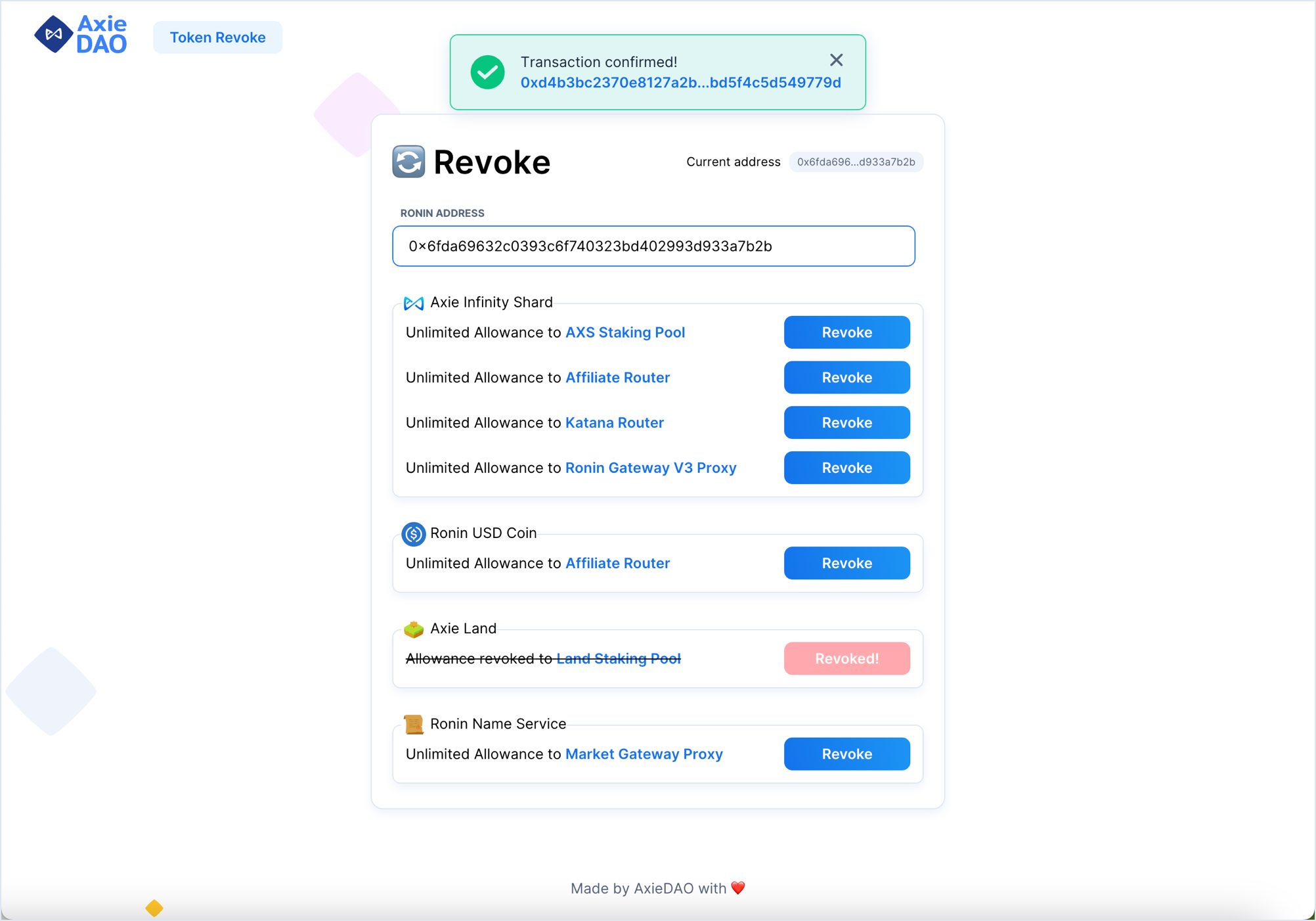 Ronin Token Revoke ("Revoke" for short) is a tool built for revoking approvals that you previoisly granted to a Ronin dApp's smart contract to handle your digital assets, such as tokens and NFTs.