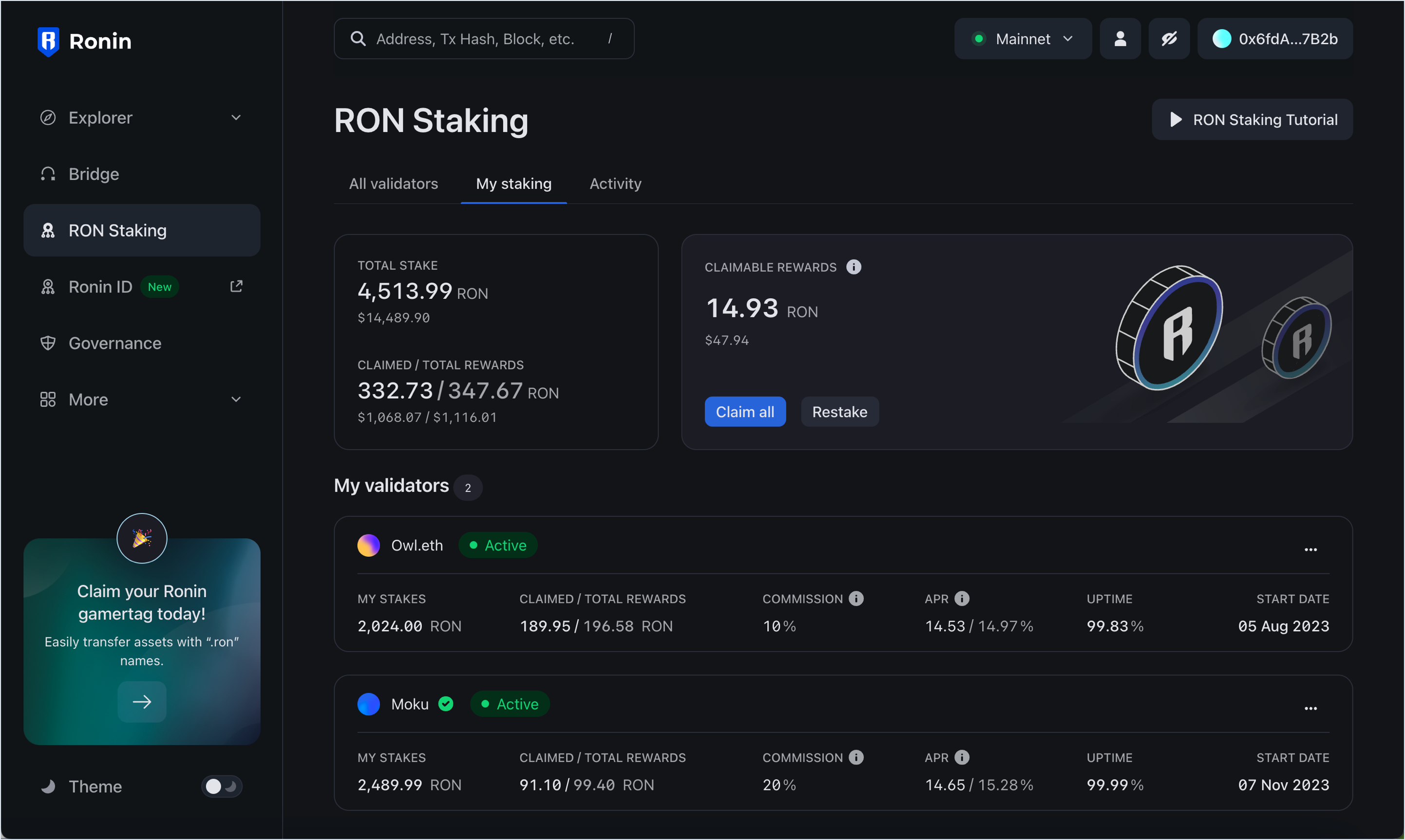 Stake your RON with your favorite validator to help secure the network while simultaneously earning some great rewards.