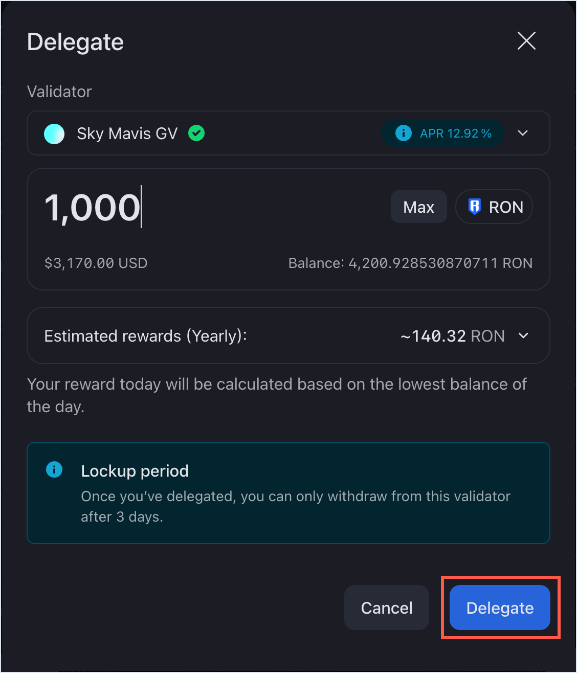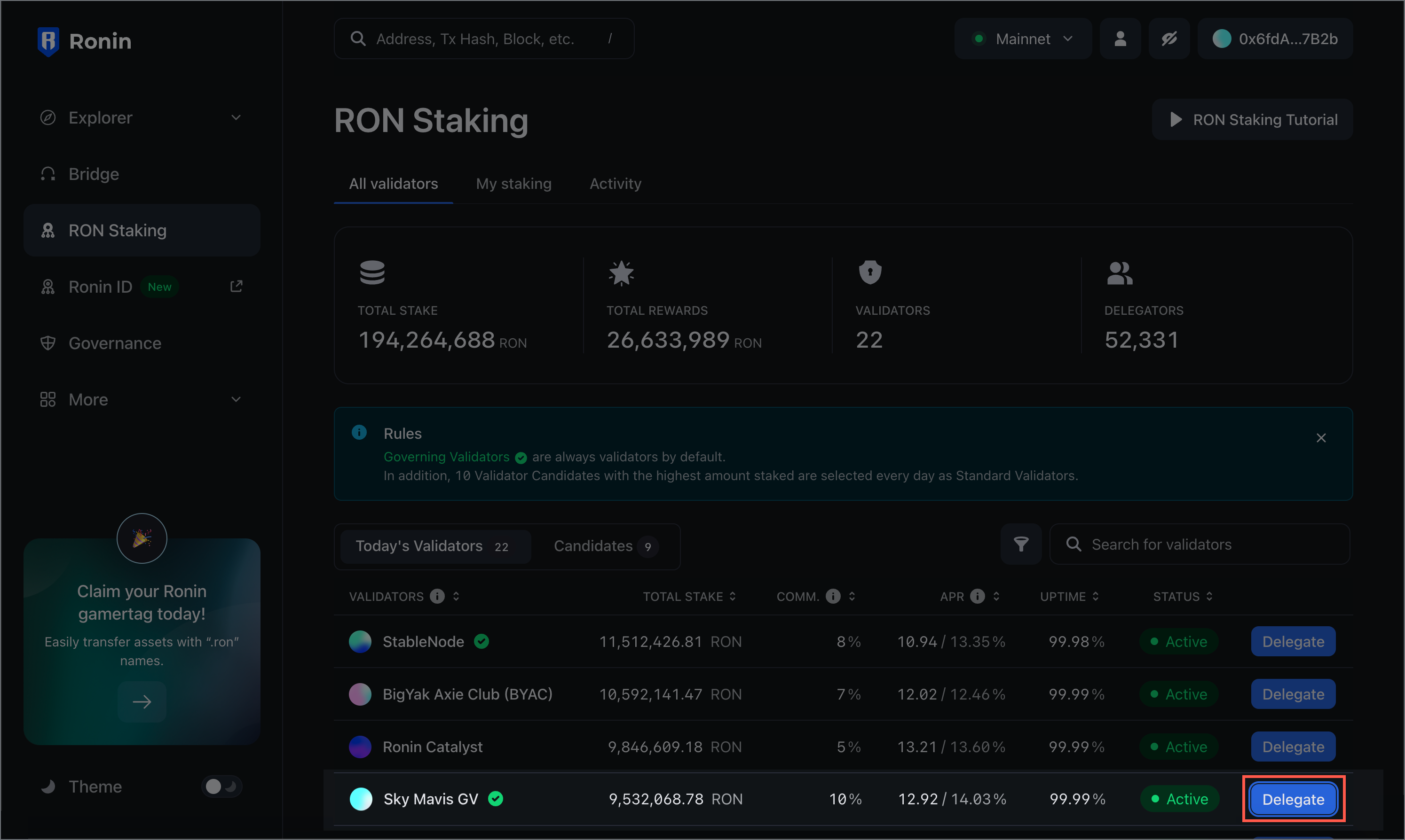This guide shows how to stake your RON tokens to your favorite validators to help secure the network and earn staking rewards. Staking is also referred to as "delegation," named after the Delegated Proof of Stake (DPoS) consensus mechanism used by the Ronin network.