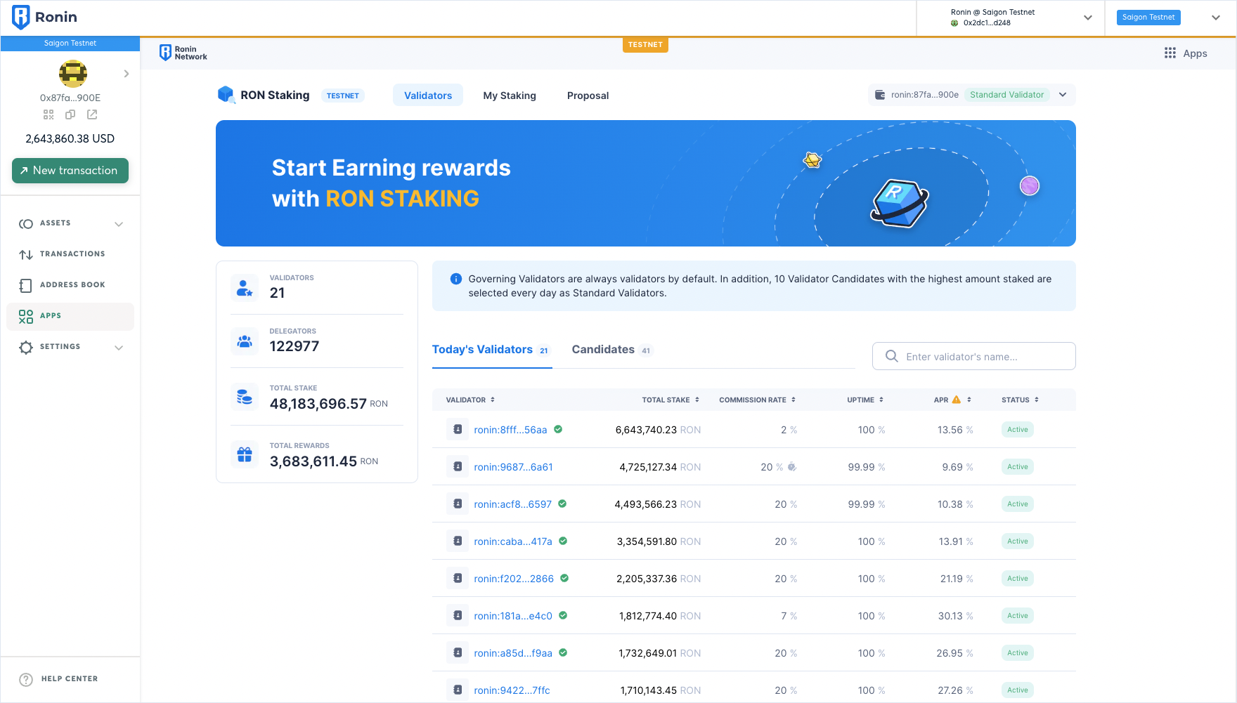 Your uptime, total staking amount, and APR (annual percentage rate).