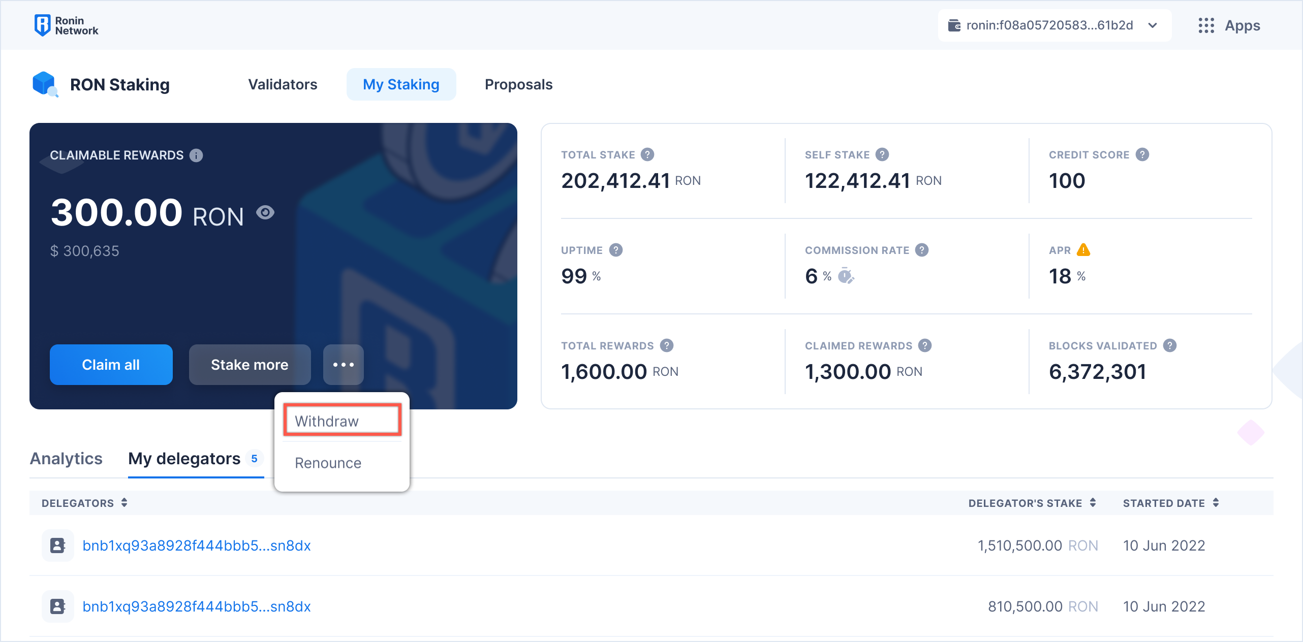 1. Open the Validator Dashboard, then select My Staking, expand the options, and then click Withdraw.