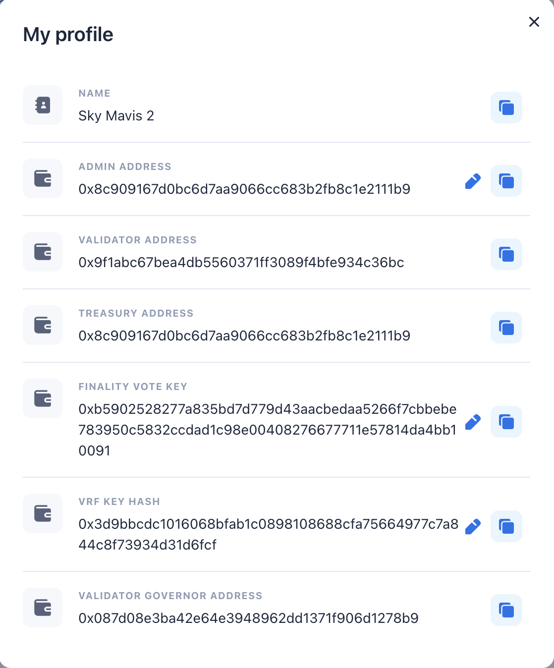 This guide demonstrates how to add a VRF key to your profile. The VRF key is used to generate random beacon. If you're an active Ronin Governing Validator, you need to have this key added.